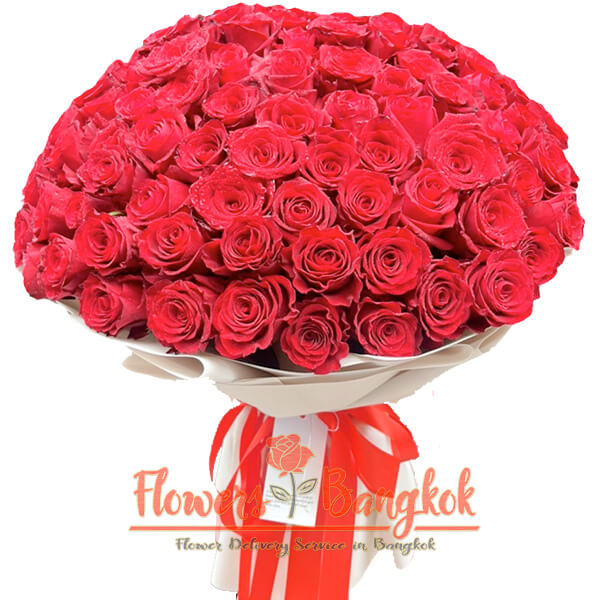 Our florists artfully arrange these 100 premium red roses with minimal green filler, allowing the natural beauty and grandeur of the flowers to shine. To enhance the presentation, the bouquet is wrapped in luxurious, bright gift paper and adorned with a matching colored ribbon, creating a striking visual impact. In addition to the breathtaking bouquet, Flowers-Bangkok offers complimentary delivery across Bangkok, ensuring your gift arrives fresh and in perfect condition. For those moments when timing is crucial, we provide same-day delivery for orders placed before 2 PM, making it possible to delight your loved one with a spectacular surprise even on short notice.