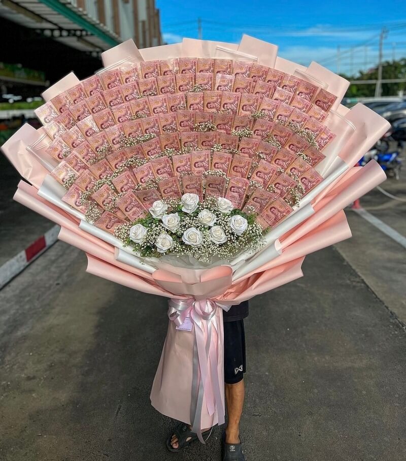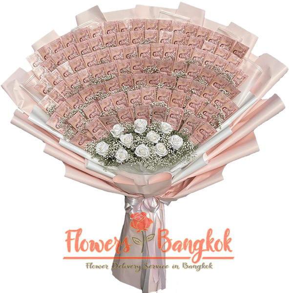 In Thailand, cash gifts hold profound meaning, conveying care and compassion. For an extraordinary statement, Flowers-Bangkok presents an awe-inspiring cash bouquet that captures grandeur like no other. Crafted with meticulous attention to detail, our dedicated team invests two days to ensure perfection. We procure 100 new (as new as possible) banknotes from the bank, each 100-baht note flawlessly incorporated into the bouquet. Behold the sight of this remarkable creation, boasting 10 premium white roses that epitomize purity and elegance. Delicately intertwined with white gypsophiles, the bouquet showcases a harmonious blend of colors and textures.