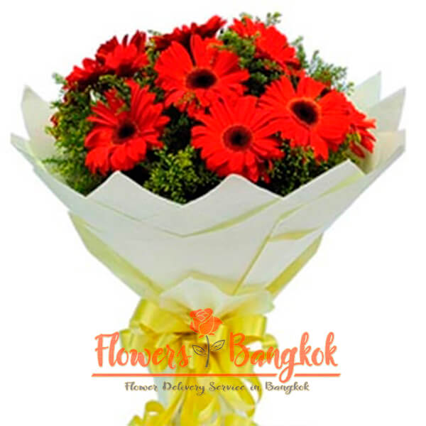 Bouquet of 12 gorgeous red gerberas. You can present this bouquet to both women and men. If a bouquet of multi-colored gerberas is a wish of well-being, happiness and good luck, then a monochrome bouquet of red gerberas usually allows you to express a very specific feeling – your sincere love and care. Unlike red roses, red gerberas do not show hot passion, but a strong, time-tested feeling. Our florist will add seasonal green filler to 12 red gerberas, which will make the bouquet more voluminous and contrasting. Also, in the arrangement of the bouquet, a special film or craft paper and a bright ribbon will be used. Depending on the season, the heart of a gerbera flower can be black or light. Upon your request, we will add a greeting card with your name and message to the bouquet of 12 red gerberas free of charge. Same day flower delivery in Bangkok is possible if paid before 3 pm.