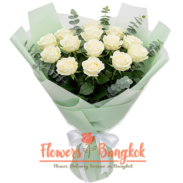 Bouquet of 12 premium white roses from Flowers Bangkok. One of the most popular bouquets in our flower shop. A bouquet of 12 white roses combines a magnificent appearance and an optimal price. You can give white roses to your beloved girl to show your tender feelings and pure love. You can also use this bouquet to express gratitude and respect to parents, relatives, teachers, colleagues or a boss of any gender. And to make a bouquet of 12 white roses even more voluminous and bright, our florists will add seasonal green filling to it.