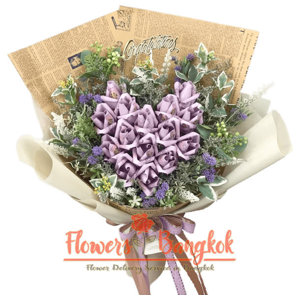 Within the realm of Thai customs, cash gifts extend far beyond mere monetary value; they symbolize a deep thoughtfulness for the recipient. At Flowers-Bangkok, we elevate this tradition to a new echelon through our exceptional money bouquet. This artistic masterpiece is the result of meticulous craftsmanship, presenting 15 beguiling lilac roses, each intricately hand-fashioned from two 500 Thai baht banknotes—culminating in an arrangement of 15 vibrant money roses. The bouquet is thoughtfully structured in the shape of a heart, a profound representation of your affection and dedication.