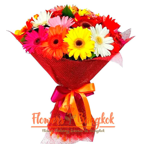 18 Mixed color gerberas from Flowers-Bangkok. A large bouquet of multi-colored gerberas – is always a bright and pleasant gift. Gerberas are a symbol of joy, good mood and happiness, so you can give a bouquet of these flowers for any reason and just as a sign of your respect and gratitude. A large bouquet of 18 gerberas will be decorated with bright film or paper, as well as a bright ribbon.
