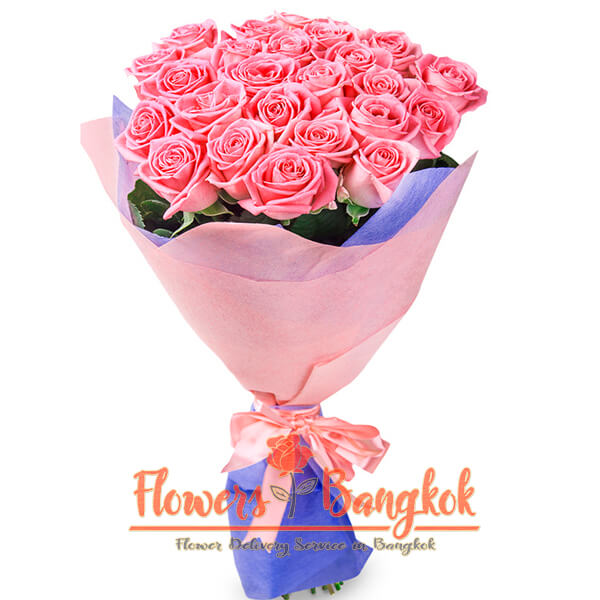 25 pink roses from Flowers-Bangkok. This bright and delicate bouquet of 25 pink roses will be a great gift for a birthday, a wedding, to express your tender feelings or sincere gratitude. To create the bouquet, large fresh pink roses with large buds and a long stem will be used. Our florist will add a little seasonal green filler to it so that the bouquet of 25 pink roses looks even more vivid and rich. A bouquet of 25 premium pink roses will be decorated with a special gift film or light-colored paper and a pink ribbon.