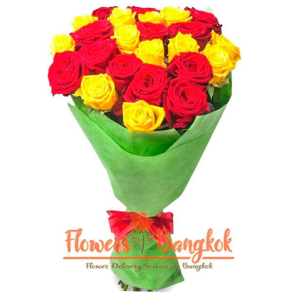 25 red and yellow roses from Flowers-Bangkok. This is one of the brightest bouquets of roses in our flower shop. The combination of yellow and red roses in one bouquet makes this bouquet very emotional. Such a bouquet can tell without any words about your passion and that you do not hide your feelings. As part of a standard bouquet of 12 and 13 roses of red and yellow. According to your desire, we can change the ratio of red and yellow roses in a bouquet while maintaining the total number of flowers. This bouquet will be decorated with a special bright ribbon, special packaging film or colored paper.