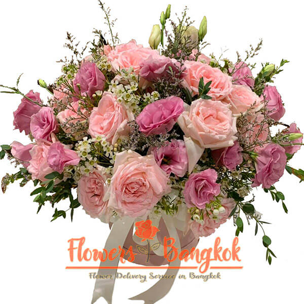 30 Premium Pink Roses in two colors from Flowers-Bangkok. Our florists use 15 soft pink roses, 15 bright pink roses and green filler to create this floral gift. This is a beautiful combination that makes the bouquet festive, vibrant and versatile for any age of the recipient. You can order such a bouquet for your girlfriend, relative, friend, colleague or business partner. There is a special water oasis at the bottom of the flower box. Therefore roses do not need an extra vase and should only add water directly to the box as needed (usually every 2 days).