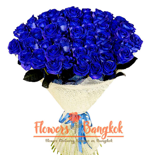 Large bouquet of gorgeous blue roses from Flowers-Bangkok. The premium blue roses that our florist uses for this bouquet are distinguished by long stems and large buds. This is one of the most expensive bouquets in our flower shop and is designed for a special person in your life. Receiving any bouquet of blue roses is always a surprise, and receiving a large bouquet of 50 premium blue roses will forever remain in the memory of your loved one and in numerous photos that she will definitely want to share.