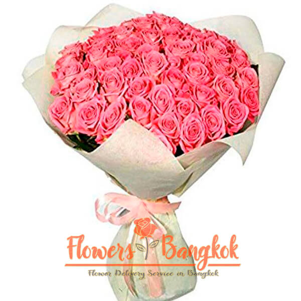 A large bouquet of 50 pink roses – a gift for special occasions – Birthday, wedding or anniversary of dating. You can also give a large pink bouquet when you want to impress your girlfriend or a girl who is not your girlfriend yet, but you want to hint in this way about your warm feelings and that your intentions are very serious. Pink roses are not as passionate as red roses, but it is these roses that are suitable for the situation when your relationship is at an initial stage. And perhaps your girlfriend just loves pink roses, because these are actually very beautiful flowers. A classic bouquet of pink roses includes a gift wrap or light-colored paper and a bright pink ribbon. We can also add a greeting card with your words or wishes for free. Free same day flower delivery in Bangkok is possible if paid before 3 pm.. Note: the length of the flowers (65-70 cm) will be slightly reduced during the design of the bouquet.
