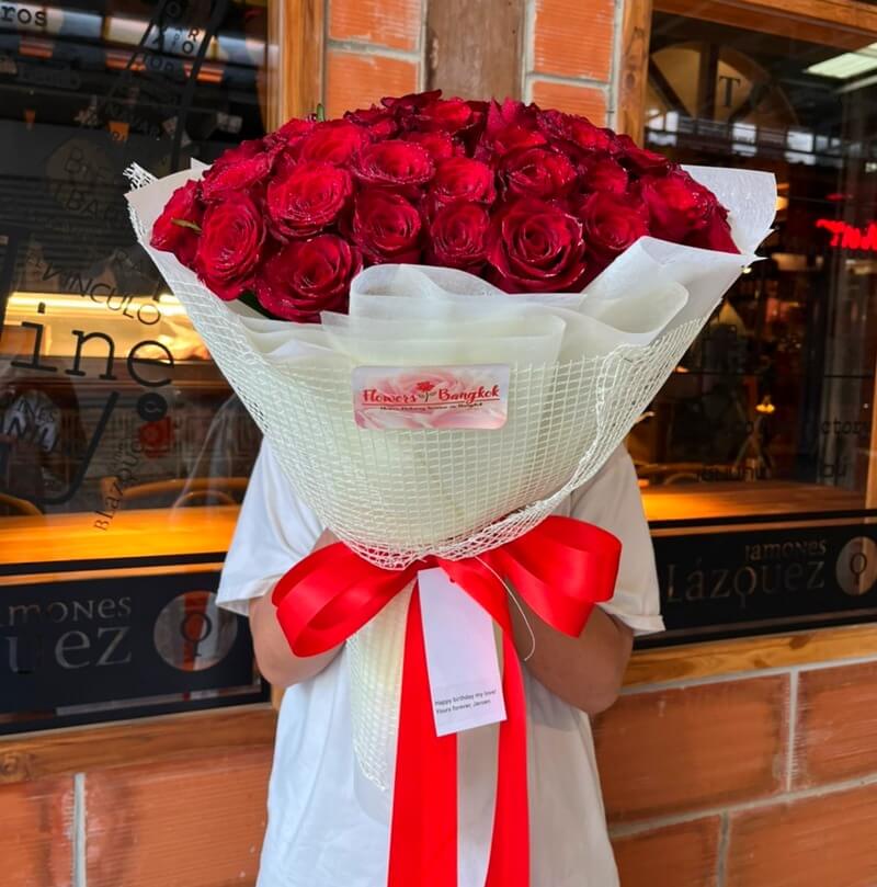 In the realm of romance, few gestures echo the depth of passion and adoration like the timeless gift of red roses. As Valentine’s Day approaches, amidst the flurry of affectionate sentiments exchanged, one offering stands out in its grandeur and symbolism: a lavish bouquet comprising fifty resplendent red roses. At Flowers-Bangkok, we understand the significance of this gesture, crafting a masterpiece that transcends mere floral arrangement to embody an expression of profound love and admiration.