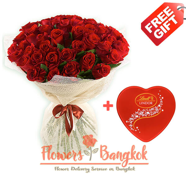 50 Premium Red Roses from Flowers-Bangkok. This is a special bouquet of love for a special person. A bouquet of 50 red roses is not only a symbol of great love and ardent passion, but also a symbol of your serious intentions. Fresh imported premium roses with large buds and long stems are used for a bouquet of 50 red roses. Our florist will add seasonal green filler to 50 red roses and decorate this large bouquet with special craft paper and bright ribbon. To this bouquet of 50 red roses we will add a box of Lindor Lindt chocolates in the shape of a red heart – a great Valentine’s Day gift. During the checkout process, you can add your message for the greeting card. Delivery of a bouquet of 50 premium red roses on any day from 11 to 15 February (please, indicate the delivery day in the calendar below).