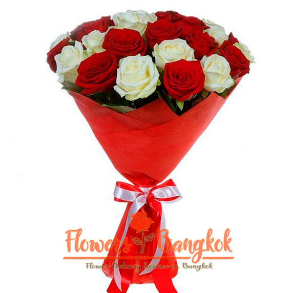 A bouquet of 21 white and red premium roses from Flowers-Bangkok. The combination of red and white in a bouquet always creates a festive mood. This is a very bright bouquet that simultaneously shows your passion and your tenderness. The perfect gift for your loved one! Seasonal green filling, which our florist will add to this bouquet, will make your gift even more vivid and contrasting. To create this magnificent bouquet, our florists traditionally use 11 and 10 premium red and white roses. But at your request, we can change the ratio of red and white roses in a bouquet while maintaining the total number of flowers. The bouquet will be decorated with bright gift wrapping or paper and a ribbon of red, white, or gold. The price includes a greeting card with your wishes and name. Free same day flower delivery in Bangkok is possible if paid before 3 pm.