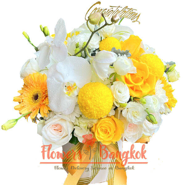 “Charming Sunshine” flower box from Flowers-Bangkok. This vibrant floral arrangement consists of mostly white and yellow flowers with a few pinks thrown in. This combination gives the flower basket a solemn and very positive look. Our florists use white, yellow and pink roses, bright yellow or light orange gerberas, yellow chrysanthemums and eustoma, as well as white orchids. You can order a “Charming Sunshine” flower box for any occasion, including for a sick person as a wish for a speedy recovery or in cases where you want to wish someone good luck in business. We would be grateful if you order this flower basket for next day or later delivery.