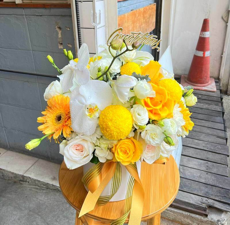 At Flowers-Bangkok, we take pride in the professionalism of our florists who painstakingly arrange each bloom to perfection, ensuring that every “Charming Sunshine” flower box is a testament to our dedication to excellence. Convenience is key when it comes to gifting flowers, and our flower box offers just that. With minimal maintenance required, caring for these blooms is a breeze – simply pour clean water directly into the box and keep them away from direct sunlight to prolong their freshness.