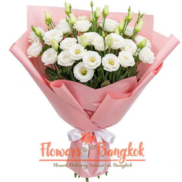 The Elegant Dream bouquet is a refined composition of more than 20 fresh white eustoma, framed in lush pink wrapping with a white ribbon. Its soft shades create an atmosphere of tenderness and sophistication, making this bouquet perfect for romantic gestures or elegant celebrations. Since such a bouquet requires careful preparation, it is not available for same-day delivery, but only for the next day or later. The pure beauty of white eustoma brings calmness and harmony, while the pink wrapping adds a subtle touch of warmth. This bouquet looks especially impressive in photographs and at festive events. Delivery in Bangkok is included in the price, while delivery to neighboring provinces and suburbs is available for a small surcharge.