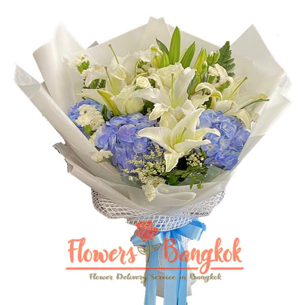 If you’re looking for a truly special floral gift, the Flower Heaven bouquet from Flowers-Bangkok is an excellent choice. This bouquet features elegant white lilies, which symbolize purity, innocence, and hope. White lilies are often given to show appreciation, admiration, and gratitude, making them a perfect choice for many occasions. The blue hydrangea inflorescences in this bouquet represent loyalty, trust, and deep feelings, making them a great complement to the white lilies. This combination of flowers creates a truly meaningful and beautiful bouquet that’s perfect for Mother’s Day, birthdays, anniversaries, and other special occasions.