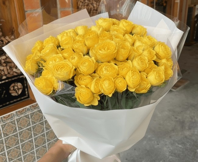 The Golden Charm bouquet radiates pure warmth with its rich yellow spray peony roses arranged in an elegant, contemporary style. Each of the 12-15 stems carries several buds, giving the bouquet an airy, textured structure filled with light and softness. The contrast of the gray valance and yellow ribbon adds a touch of sophistication, making it suitable for both personal and formal occasions. Our peony roses are small in size, but each bud opens wide and becomes much larger once the bouquet is placed in a vase.Yellow roses traditionally symbolize friendship, success, and happiness, making them ideal for celebrations and uplifting moments. Flowers-Bangkok assembles this bouquet to create a smooth blend of brightness and elegance.