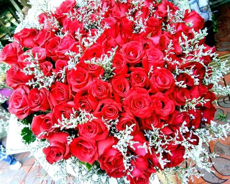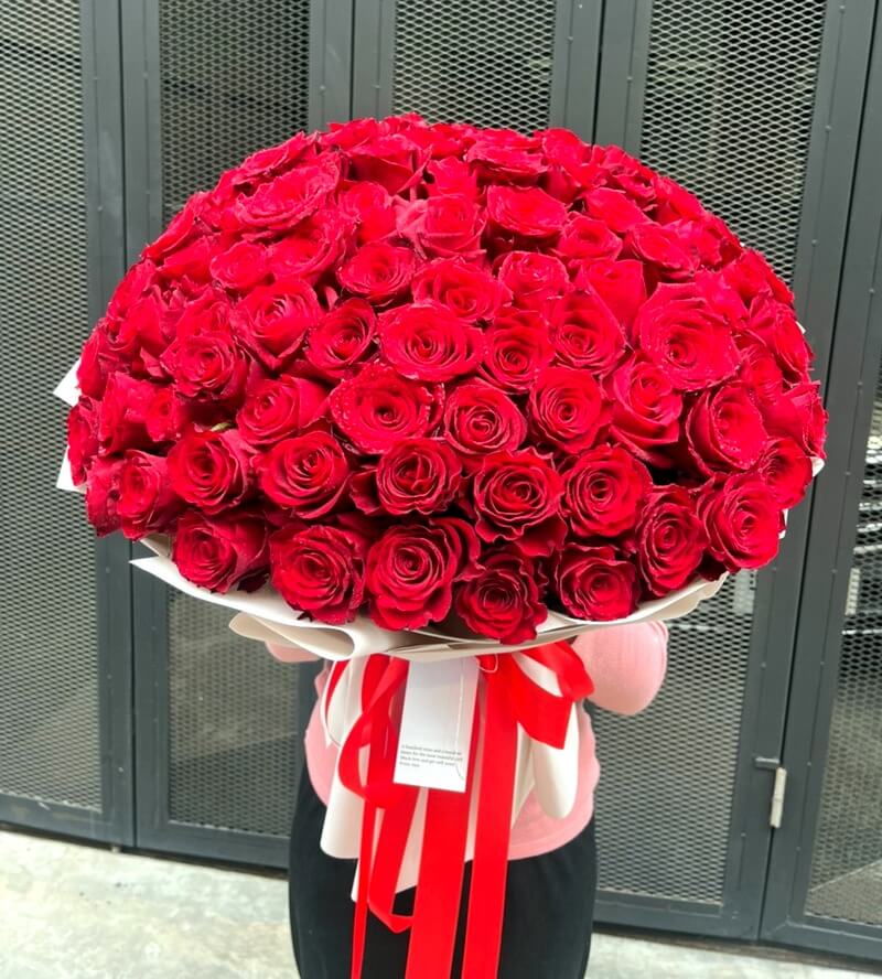 Crafted with meticulous care, each of the 100 red roses within this luxurious bouquet is sourced from the finest imported blooms, ensuring an unparalleled display of beauty. The roses boast large, exquisite buds and elegant, elongated stems, embodying the epitome of sophistication and passion. To enhance the allure of this monumental bouquet, our skilled florists artfully incorporate seasonal green fillers, selecting from a harmonious blend of gypsophila, statice, or round eucalyptus leaves. The verdant accents complement the radiant red roses, creating a visually stunning masterpiece that captivates the senses.