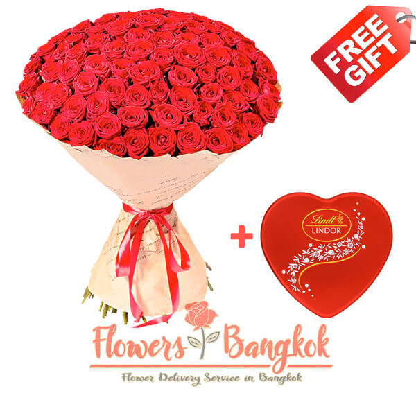Introducing our exclusive and enchanting creation, the Grand Royal Romance Bouquet, featuring an opulent ensemble of 100 premium red roses meticulously curated by Flowers-Bangkok. This monumental bouquet is not merely a floral arrangement; it is a profound declaration of love and an extravagant gesture for that special someone in your life, setting the stage for an unforgettable Valentine’s Day. A huge bouquet of 100 red roses is 100% love for a special person in your life and the largest bouquet for Valentine’s Day in our store. For a bouquet of 100 red roses, only fresh imported premium flowers with large buds and long stems are used. Also to the bouquet of 100 red roses we will add a box of Ferrero Rocher chocolates or Lindor chocolates from Lindt in the shape of a red heart – a great gift on Valentine’s Day. During the checkout process, you can add your personalized message for greeting card. Delivery of a bouquet of 100 premium red roses is guaranteed on any day from 11 to 15 February (please, indicate the desired delivery day in the calendar below).