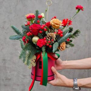 The bouquet’s name, “Jolly Red,” reflects the classic Christmas color palette that has long symbolized joy, warmth, and celebration. By combining different red blooms with deep green fir, this design embraces the happiest side of the holiday season. The bright red wrapping and green ribbon reinforce the playful, traditional theme that many people associate with December festivities. This makes the bouquet an excellent gift for friends, relatives, or colleagues who appreciate traditional Christmas décor. It is also ideal for decorating homes, hotel lobbies, or offices during the holidays.