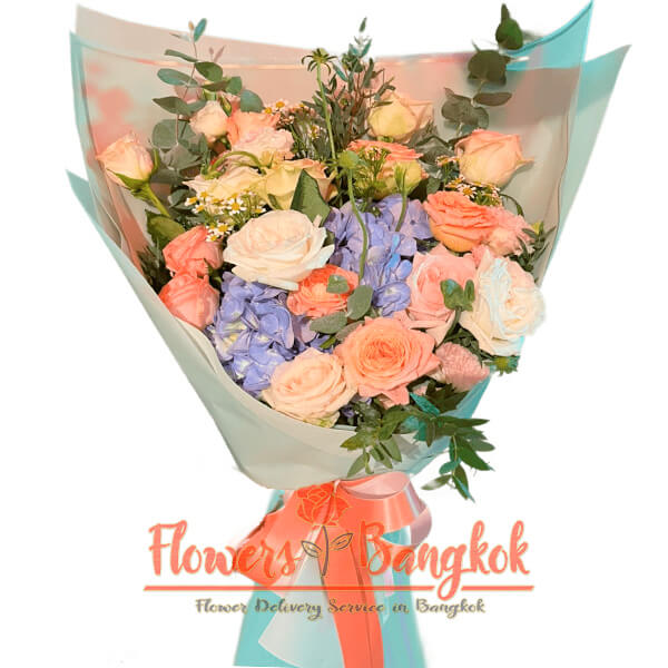 The Love’s Palette bouquet of pink and orange roses and hydrangea from Flowers-Bangkok is a stunning, vibrant creation that is perfect for expressing love, admiration, and affection. This lavish bouquet, comprised of at least 21 roses in various shades of pink and pink-orange, along with lush blue hydrangea and fresh green filler, is an ideal gift for those special moments when you want to convey your deepest feelings. It’s the perfect choice for anniversaries, romantic gestures, or to surprise a loved one “just because.” The bouquet comes beautifully wrapped in light blue gift paper with a satin ribbon and includes a personalized greeting card, making it a heartfelt gift for anyone who appreciates the language of flowers.