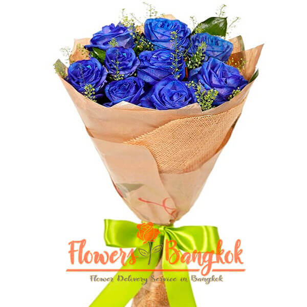 Lucky Blue bouquet is a bright bouquet of 9 premium blue roses from Flowers-Bangkok. These unusual and unique flowers will emphasize your special attitude towards the recipient of the bouquet. For a more voluminous bouquet of 9 premium blue roses, our experienced florist will add seasonal green filler or white gypsophila to it, which looks great with blue roses. Please note that blue roses do not exist in nature and they are all the result of a special process of natural intracellular coloration or using special aerosol paint for a more uniform and quick coloring of white rose buds in blue.. Therefore, delivery of blue roses on the day of order is not possible and we recommend placing an order at least 1.5 days before delivery.