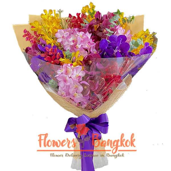 Bouquet of mixed orchids from Flowers-Bangkok. One of the brightest bouquets in our flower shop. Each orchid color has a different meaning, but this bouquet is a truly versatile gift. Due to the large number of orchids with large and smaller flowers of various colors, you can order this bouquet as a gift for a birthday, anniversary or other important event. Our florists will add seasonal green filler to the bouquet, which will make the bouquet even more contrasting and festive.