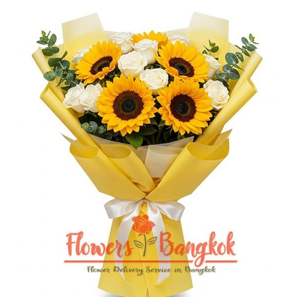The arrangement is carefully wrapped in soft yellow-and-white paper with a white ribbon, emphasizing the contrast between the golden sunflowers and pristine roses. At our flower shop in Bangkok, we select only premium blooms to ensure each bouquet arrives fresh and vibrant, even in the city’s tropical climate. Eucalyptus leaves add structure and a cool tone to balance the sunny and pure palette, making the bouquet suitable for any recipient, regardless of gender or age.