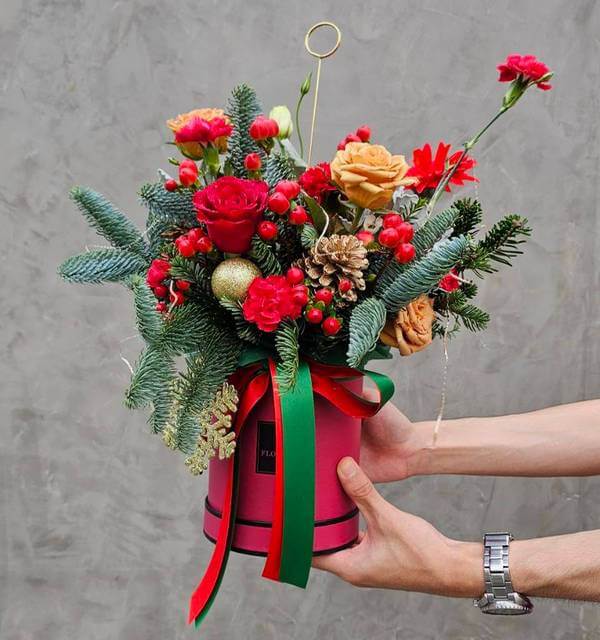 The Noel Bloom Flower Box is a charming festive arrangement that brings the beauty of Christmas into a compact, easy-to-place design. Fresh fir branches add texture and the scent of winter, while red carnations and red roses create a warm, traditional holiday color palette. Hypericum or holly berries add brightness and cheerful detail, making the box look like a miniature Christmas decoration. Pinecones and small ornaments may also be added depending on availability. The berries are natural but decorative only and should not be consumed.