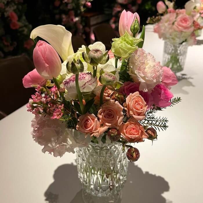Each vase is designed with balance in mind, combining soft pastel pinks with richer shades to achieve depth and harmony. Tulips bring an air of freshness and renewal, while roses convey affection and sophistication. Depending on the season, our florists may include other blooms such as carnations, lisianthus, or hydrangea, ensuring the arrangement always feels full and luxurious. For event planners and hosts in Bangkok, ordering multiple vases ensures a consistent and elegant décor scheme throughout the venue.