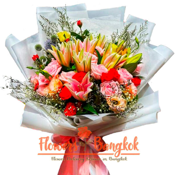 A large and bright bouquet of fresh pink lilies and roses. This bouquet will be a great choice for the birthday or anniversary of your wife or girlfriend. Fresh pink lilies in a bouquet will show that your tender feelings are still very strong and mean a lot to you. Pink and red roses will further emphasize your sincere love and deep passion. A large bouquet of pink lilies and roses will be decorated with craft paper and bright ribbon. And the addition of seasonal green filler will make this bouquet even larger and more festive. The cost of the bouquet includes a greeting card with your message to the recipient, which we will write by hand. Same day flower delivery in Bangkok is possible if the order is paid before 3 pm.