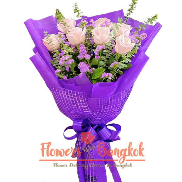 The Pink Purple bouquet from Flowers-Bangkok is an exquisite ensemble that carries deep symbolism and heartfelt emotions. This carefully crafted arrangement combines the elegance of pink roses with the enchanting allure of lilac or purple kermek flowers, accompanied by a touch of verdant filler. Pink roses symbolize appreciation, grace, and admiration, making them an ideal choice for various occasions. Whether it’s Mother’s Day, the beginning of a romantic relationship, birthdays, anniversaries, graduations, or simply a gesture of affection, these roses convey sentiments of love and tenderness. The inclusion of kermek flowers, also known as limonium, adds a charming touch with their delicate blooms that represent everlasting beauty and memories.