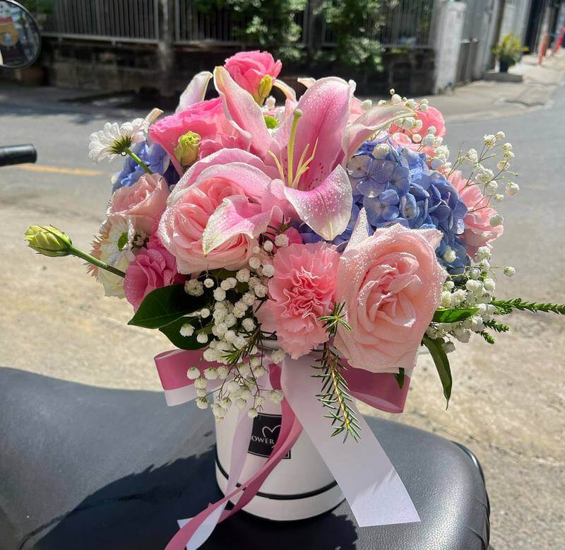 The enchanting Pink Talisman flower box from Flowers-Bangkok, a captivating ensemble of delicate pink blooms meticulously arranged to convey heartfelt sentiments. Perfectly suited for a variety of occasions, this compact yet exquisite round flower box is a testament to elegance and affection. At its heart lies a radiant blue hydrangea, symbolizing gratitude and heartfelt emotion, encircled by a mesmerizing array of lilies, roses, and carnations in varying shades of pink. Accentuated with touches of ethereal white gypsophila and other complementary blossoms, each petal exudes a sense of grace and tenderness.