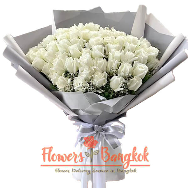 Pure Affection bouquet from Flowers-Bangkok features 60 stunning imported white roses, each representing purity and respect. This impressive bouquet is ideal for expressing deep admiration, celebrating life’s milestones, or offering condolences. With delicate packaging in gray, green, or white and a satin ribbon bow, this bouquet is a thoughtful way to convey heartfelt sentiments. Free delivery within Bangkok and extended delivery to nearby provinces is available for a small fee.