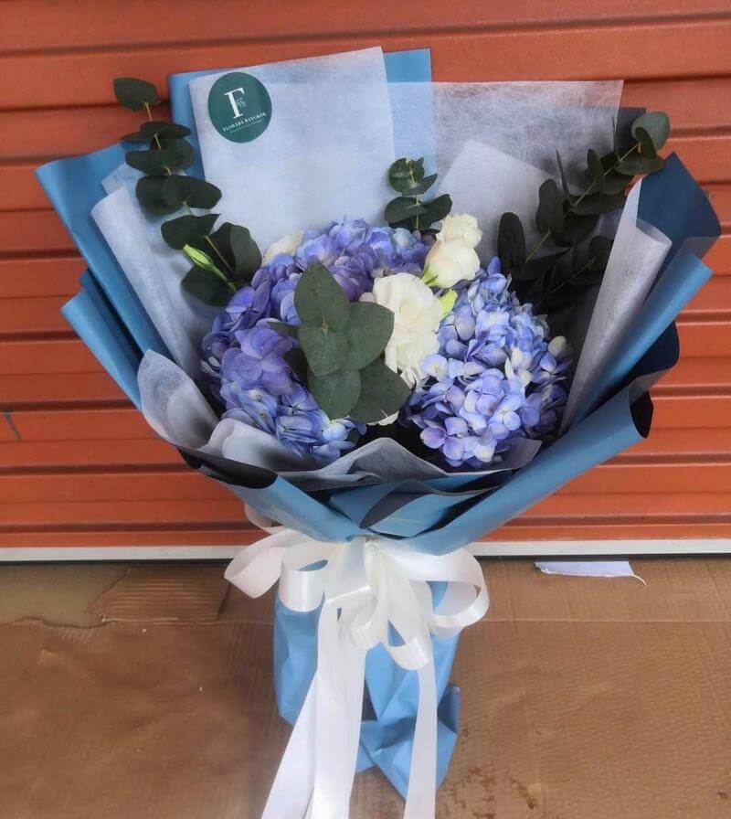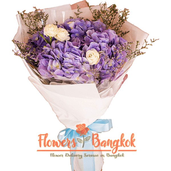 Delicate bouquet of hydrangea and white roses. In the language of flowers, hydrangeas symbolize purity, sincere love and boundless happiness. That is why florists usually add white roses to a hydrangea bouquet, the flowers of which convey a similar meaning. A bouquet of a large number of delicately purple hydrangea flowers and three white roses will tell you better than any words about your tender and sincere feelings. Our florist will arrange a bouquet of hydrangeas and white roses in special light paper and decorate the bouquet with a ribbon of a pleasant, but not very bright color. Also, at your request, we will add a small card with your name and congratulations to the recipient for free to the bouquet. Same day flower delivery in Bangkok is possible if paid before 3 pm.