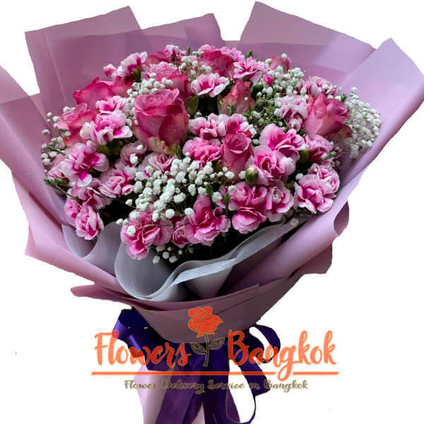This large bouquet is new to our flower shop in Bangkok. A bright and festive bouquet consists of three types of flowers at once, which complement each other and match perfectly in color. The base of the bouquet is 10 fresh purple or hot pink roses. Also in the Purple Passion bouquet there is a large number of carnation flowers that match well in color and size with roses. White gypsy flowers add splendor to the bouquet, against which purple roses and carnations look most vivid. The bouquet is versatile and can be delivered to both women and men of any age. Our florists use only the freshest flowers and the bouquet will be wrapped in beautiful craft paper and decorated with a bright ribbon. At your request, we will add a greeting card with your name and a message to the recipient to the Purple Passion bouquet free of charge. Same day flower delivery in Bangkok and its suburbs is available when ordering and paying for the bouquet until 2 pm.