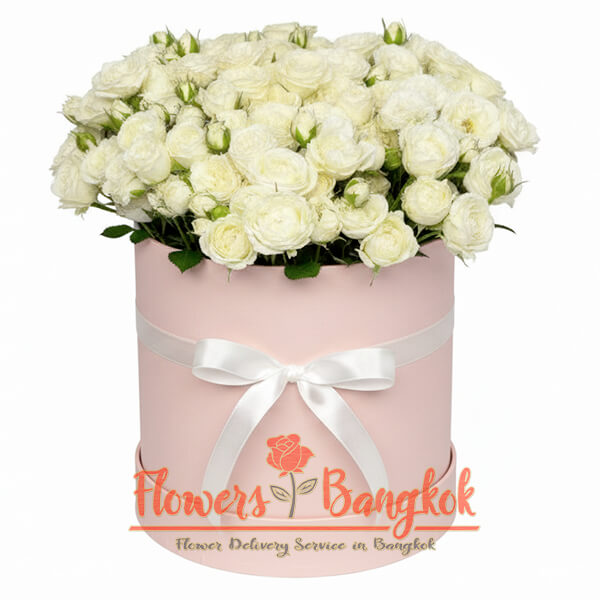 The Snow Embrace flower box from Flowers-Bangkok is named for the soft and pure feeling created by dozens of white rosebuds gathered into one harmonious arrangement. The delicate white color symbolizes sincerity, elegance, and calm emotions, while the many small blooms create the impression of a light floral cloud. With approximately 120 buds in total, this composition looks rich, airy, and beautifully balanced. Each spray rose adds texture and depth, making the arrangement feel more natural and expressive than classic single-bloom bouquets. The result is a refined and memorable floral gift suitable for many occasions.