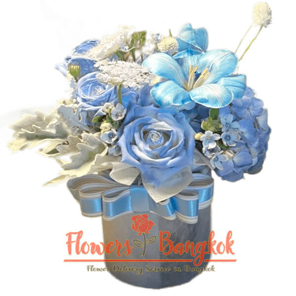Surprise your cherished mother with a delightful flower gift from Flowers-Bangkok, the premier flower shop in Bangkok. Our small flower box, thoughtfully arranged with fresh blue and white roses, a captivating blue hydrangea, a splendid blue tulip, and a seasonal green fill in white, also features the enchanting oxypetal blue flowers. Oxypetal blue, with its unique name and mesmerizing hue, symbolizes harmony and peacefulness, making it a perfect addition to this heartfelt bouquet. In Thailand, blue flowers hold a special significance as they represent serenity, tranquility, and everlasting love. As Mother’s Day approaches, there couldn’t be a more fitting present to express your gratitude for all the love and care she has bestowed upon you. The blue hues in this exquisite bouquet reflect the endless skies, mirroring the boundless affection and admiration you hold for your mother. With its elegant blue ribbon, this flower box not only exudes beauty but also comes with free shipping anywhere in Bangkok. Show your love with this stunning arrangement, featuring the captivating oxypetal blue, and let Flowers-Bangkok be your trusted choice for the perfect Mother’s Day surprise.