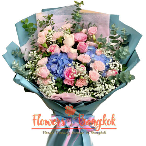 Big festive Sweet Kisses bouquet from Flowers-Bangkok. Our florists use a wide variety of fresh flowers to create this bouquet. The color range is selected in such a way that all flowers are harmoniously combined with each other. The Sweet Kissing bouquet uses delicate pink roses and pink carnations, as well as blue or pink hydrangea. Lisianthus, gypsophila and decorative green leaves give volume and additional charm.