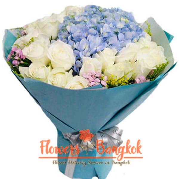 A large bouquet of gorgeous white roses and delicate hydrangeas. Great gift for birthday, dating anniversary or wedding. Also, a bouquet of hydrangeas and white roses will be a good proof of your special relationship with your loved one. Tender Dream bouquet consists of 18-20 premium white roses and one or more hydrangea inflorescences of blue, lilac or pink color. The cost of the bouquet includes special gift wrapper and delivery in Bangkok.