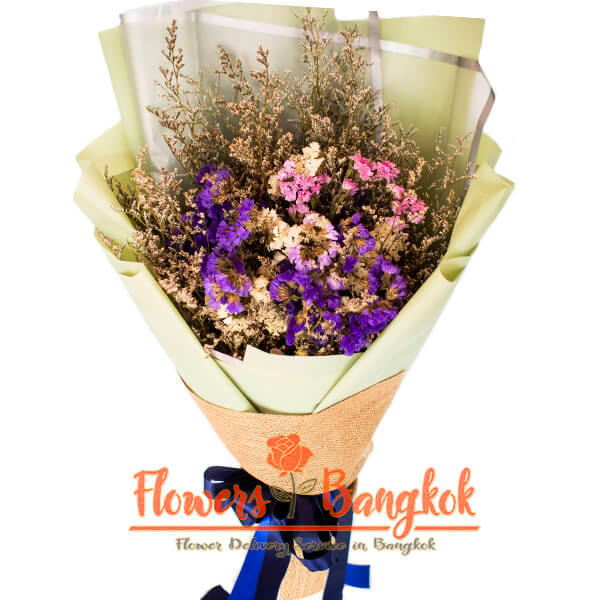 Delicate bouquet from Statice flowers with the addition of seasonal green filler. The flowers of Statice, also called Limonium, symbolize memories in the language of flowers. A bouquet of bright fresh statice flowers is a good gift for the person you often think of and with whom you have many pleasant memories. Statice belongs to dried flowers, so your bouquet of fresh flowers can be stored for a very long time in a dried form. And for a long period, statice inflorescences will retain their original color and shape, reminding about of the person who gave these flowers. Our florist will arrange a bouquet of statice in special light paper and decorate the bouquet with a bright ribbon. At your request, we will add a card with your words for the recipient to the bouquet free of charge. Same day flower delivery in Bangkok is possible if paid before 3 pm.