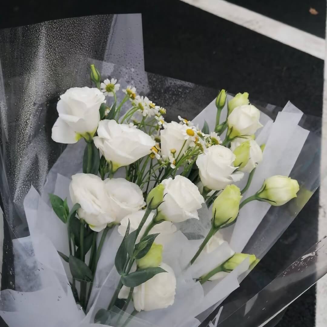 The bouquet of white eustoma (lisanthus) and small daisies is a graceful composition that combines modern style with timeless symbolism. The transparent wrapping and white ribbon underline its clean, elegant appearance. This is not a same-day bouquet; it requires at least one day’s notice for delivery, ensuring every stem is carefully prepared to meet the highest standards.