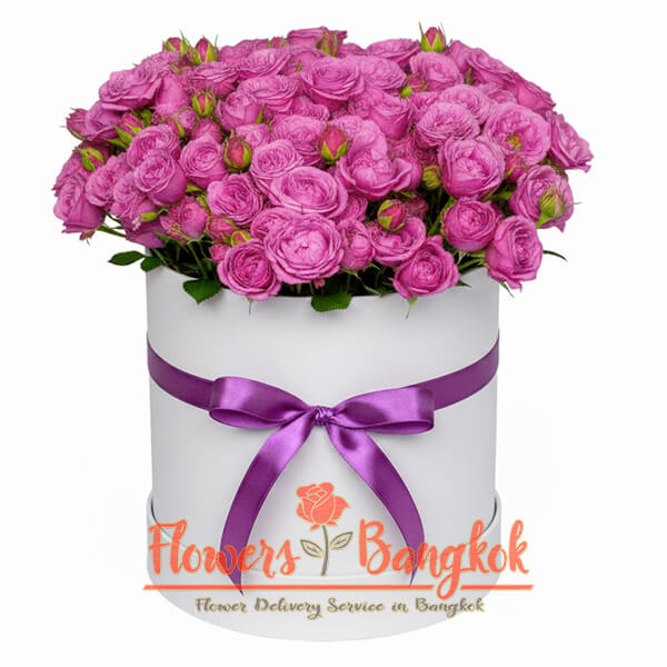 The Velvet Charm flower box from Flowers-Bangkok is a rich and expressive arrangement made from 20 stems of deep pink or lilac-pink spray roses, each featuring 5–7 delicate buds. Thanks to this natural structure, the composition includes around 120 small rosebuds, creating a lush and voluminous floral display. The deep pink and lilac tones give the arrangement depth and elegance, making it especially eye-catching. Our florists arrange the flowers in a stylish flower box, which may be white, pink, or black, and complete the design with a refined white ribbon. Some buds may be delivered slightly closed, but they will gradually open, increasing the volume and beauty of the arrangement over the next few days. This flower box is an excellent gift for romantic occasions, birthdays, or to express admiration and warm feelings. Before placing an order, we recommend contacting our store managers via chat, WhatsApp, or email to confirm the exact shade of the roses — we will send you photos of available options from our supplier.