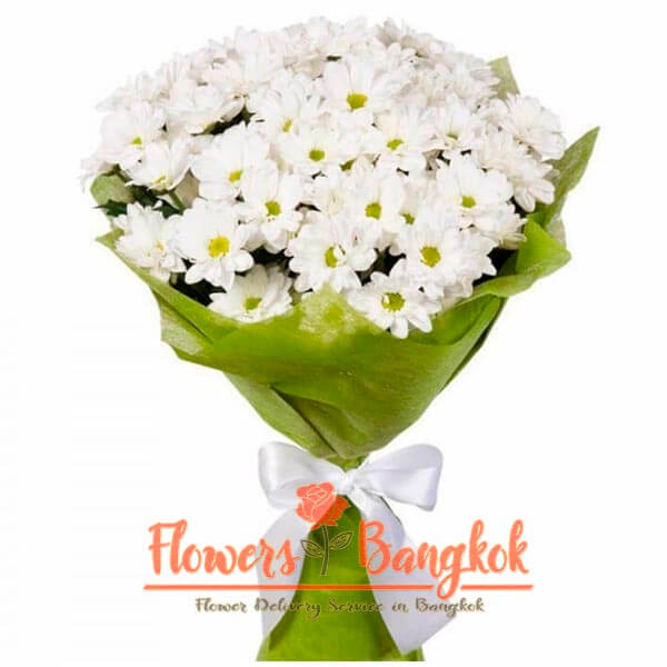 Bouquet of White Chrysanthemums from Flowers-Bangkok. Ordering this bouquet will be a good choice when you want to show your sincerity and loyalty, as well as when you think the recipient of the bouquet is sincere, gentle and noble person. Order delivery of a bouquet of chrysanthemums for your loved one, good friend or close relative. Our florists use the freshest chrysanthemums with a natural floral scent. Chrysanthemums do not have very long stems, but they have very lush inflorescences. Therefore, traditionally, no additional green filler is used in chrysanthemum bouquets. A bouquet of white chrysanthemums will be decorated with special craft paper and a bright ribbon. The price of the bouquet includes a greeting card with your message, which you can add on the checkout page. Free delivery of flowers in Bangkok on the same day is possible if the order is paid before 3 pm.