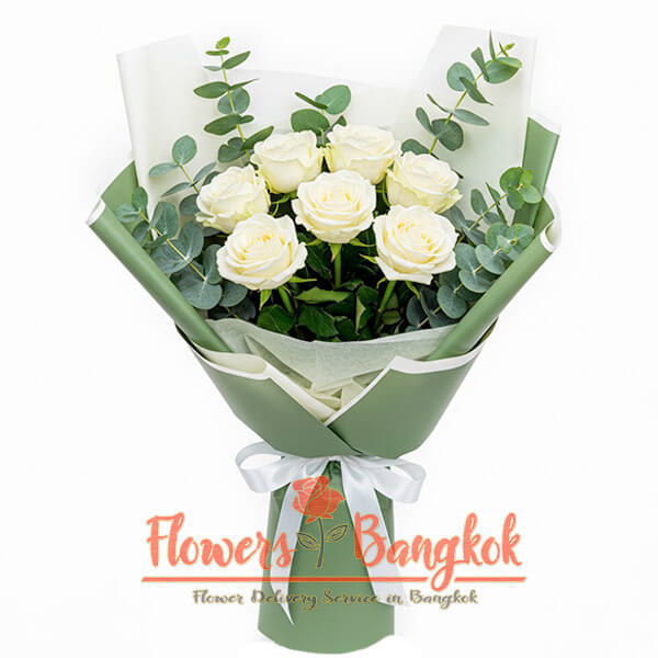 The White Compliment bouquet is a charming arrangement of 7 premium white roses, complemented by round eucalyptus leaves, wrapped in a beautiful green wrapper with a delicate white ribbon. This elegant bouquet is perfect for any occasion, whether it’s a birthday, anniversary, or simply to express your affection. Suitable for any gender and age, it’s a graceful way to send your best wishes. For seamless flower delivery in Bangkok, choose this timeless arrangement from our flower shop in Bangkok.