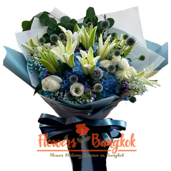 Large bouquet of white lilies from Flowers-Bangkok. This delicate bouquet is made up of not only white lilies, but also complementary flowers including white roses )(or white eustoma), white gypsophila and blue hydrangeas. The bouquet will be decorated with green leaves and blue craft paper, making it a great choice for Mother’s Day delivery in Thailand. It is on this day, according to a long-standing tradition, that bouquets of blue flowers or white flowers in a blue wrapper are the most popular in Thailand. Fresh white lilies and premium white roses are a great combination for any occasion, so you can order a bouquet like this for delivery in Bangkok anytime. In the language of flowers, such a bouquet will mean loyalty, tenderness, pure love and sincere gratitude. We will post your message to the recipient of the bouquet on our branding greeting card for free. Same day flower delivery in Bangkok is possible if you pay for your order before 3 pm.