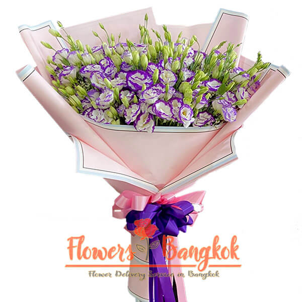 A chic bouquet of Eustoma from Flowers-Bangkok. Lisianthus (eustoma) flowers are very versatile. You can present a bouquet of these flowers for absolutely any reason. On a birthday or anniversary date, on the occasion of success in your career or in school, as an expression of your respect and gratitude – in all these and many other cases, a bouquet of fresh eustoma will be appropriate. Our florists will decorate a large bouquet with a special bright wrapper with a ribbon.