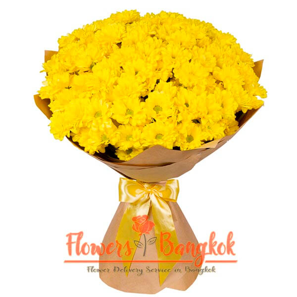 Large bouquet of yellow chrysanthemums from Flowers-Bangkok. In the language of flowers, such a bouquet can mean the first declaration of love. In addition, a bouquet of yellow chrysanthemums is a good choice for a friendly gift or for a present for your beloved man. Like all yellow flowers in Asia, yellow chrysanthemums are symbols of wealth, health and good luck. The price of the bouquet includes a bright wrapper, a decorative ribbon with a bow and a greeting card with your message.